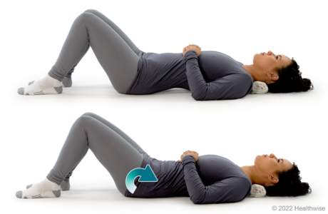 - Tighten your belly muscles by pulling your belly button in toward your spine. Press your lower back to the floor. You should feel your hips and pelvis rock back.