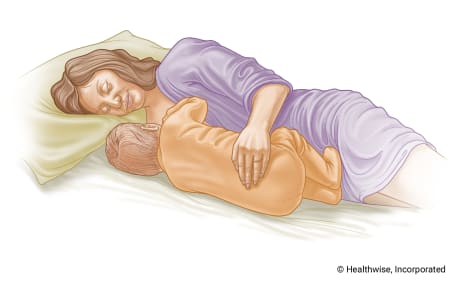In the side-lying position, you and your baby lie on your sides facing each other. You can place pillows behind the baby's back for support. Your baby's mouth should be close to your nipple. The hand on your top side supports your lower breast and guides it into your infant's mouth. After the baby has latched on, you can use this arm to cuddle your baby into you closely.